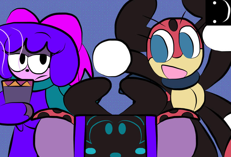 Mystic/Mysona SheepThe snarky purple sheep with big glasses and a turquoise scarf who serves as my sona, as her name suggests. The mammal doesn't take kindly to people who drive her up the wall, thus her coffee addiction and screaming matches.Baylen, aka Bay, LedianThe jackass to Mysona's wiseass, Bay, exposed to the wide web, is best described as the reason for issues. However, this assholery and hate of the Spinark line is not her fault, as she was aged ten years during her prime time as a fighter.Vivi MagisionIf Mysona and Bay are there to butt heads with each other, Vivi is the beacon whenever the fighting turns loud. Vivi can't talk; their words are shown in Earthbound text boxes, and they can also use the attacks from the SNES game.